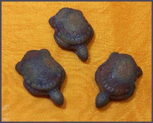 They're from Peru. They're ceramic. They're handpainted. The hole is nape to belly. Almost an inch and a quarter from the tip of her nose to her tail.
