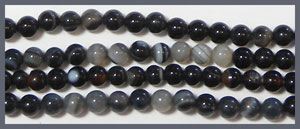 Temporarily strung (claspless) Shiny black with the occasional white banding. There are about 85 beads on a 4mm strand.